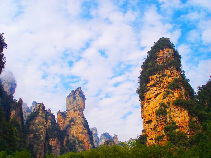 天門(mén)山國(guó)家森林公園四面絕壁,雄偉壯麗。保存著完整的原始次生林,植物資源豐富,有世界罕見(jiàn)的高山珙桐群落。天門(mén)山文化底蘊(yùn)深厚,留有大量贊詠天門(mén)山的詩(shī)詞,更有眾多神聞傳說(shuō),被譽(yù)為“張家界之魂”。山頂天門(mén)山寺自唐朝建成以來(lái)香火鼎盛,寺外有七級(jí)浮屠,掩映于青枝綠葉中,古雅幽清。善男信女入寺拜佛,撞鐘響徹天際,擊鼓震動(dòng)山岳,香煙裊裊如云。明萬(wàn)歷年間南岳僧在此傳經(jīng)授戒,從此聞名遐邇,朝山拜佛者達(dá)周邊四郡十余縣,信士遍及湘西北,天門(mén)山因此成為 “湘西第一神山”。天門(mén)山終年云霧繚繞,云海景象變化無(wú)窮。山間溶丘、石芽廣布,奇石秀木及珍禽異獸繁多,更有飛瀑流泉噴涌而出。天門(mén)山兼峰、石、泉、溪、云、林于一體,集雄、奇、秀、險(xiǎn)、幽于一身,被譽(yù)為空中原始花園。天門(mén)洞、天縫渡仙、五指山、將軍石等是有名的峰林景觀,還有神秘的千佛洞等待你的探奇;山間的韓家溝則是富蘊(yùn)滿族風(fēng)情的村落——這里久居的幾十戶滿族農(nóng)家至今仍完好保留著其在語(yǔ)言、飲食、衣著、居住以及婚慶殯葬等方面的滿族風(fēng)俗,是難得的民俗文化旅游地。