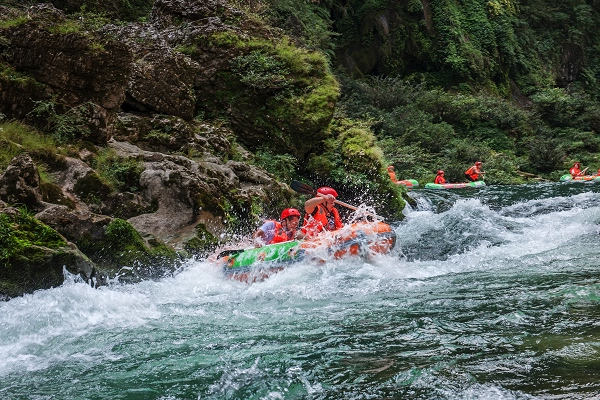 猛洞河水量豐富,河流坡降大,水急灘多浪奇,高大的峭壁直插水面,兩岸并相靠攏,形成幽深的峽谷景觀。沿河兩岸古木蒼天,蒼翠欲滴,奇石錯(cuò)落,流泉飛瀑隨處可見(jiàn),下游一路水碧山青,風(fēng)光秀麗,野猴成群,溶洞奇特。猛洞河天下第一漂項(xiàng)目位于猛洞河支流,全長(zhǎng)47公里,最精彩處位于哈妮宮至牛路河段,長(zhǎng)約17公里。該景區(qū)兩岸多為原始次森林,蔥蔥郁郁,水流湍急,碧綠清亮,有十里絕壁,十里瀑泉,十里畫(huà)卷,十里洞天的美譽(yù)。其中有急流險(xiǎn)灘108處,大小瀑布20處。漂流,穿急流,越險(xiǎn)灘,闖狹谷,捕激浪,有驚無(wú)險(xiǎn),回味無(wú)窮。特別是哈妮宮、三角巖、雞籠門(mén)、遇仙峽(捏土)、閻王灘、落水坑、夢(mèng)思峽、鯉魚(yú)剖肚、三大炮等景點(diǎn),無(wú)不令人叫絕觀止。