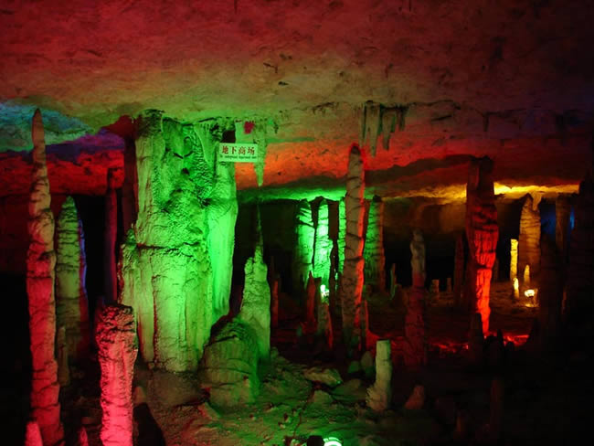 九天洞位于湖南張家界市桑植縣城17公里的利福塔鄉(xiāng),距市區(qū)70公里,距武陵源62公里,因洞內(nèi)有九個(gè)自然天窗九天洞而得名,總面積250公頃,是中國目前發(fā)現(xiàn)的溶洞之最,比號稱世界第一的利川溶洞大三倍。九天洞內(nèi)空氣清新,冬暖夏涼。整座洞穴分上、中、下三層,有五層不同高度的螺旋式觀景臺(tái),最下層低于地表面400多米。經(jīng)初步探明洞內(nèi)有40個(gè)大廳、3條落差懸殊的陰河、12條瀑布、5座自生橋、10余座洞中山,此外,還有不可勝數(shù)的五光十色的鐘乳石群。在眾多迷人的景觀中尤以九星山、玉宮、水晶宮、九天玄女宮、壽星宮五大奇觀最為著名。